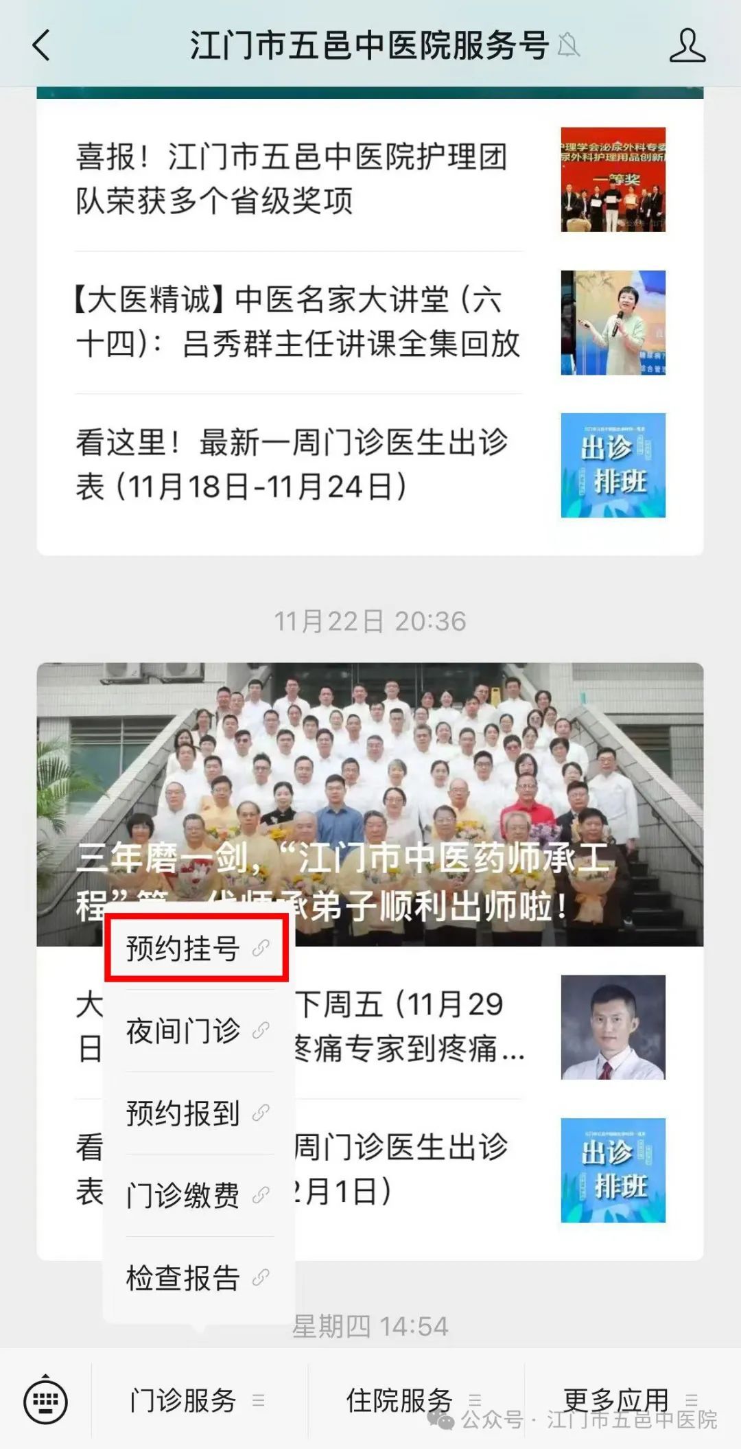 四、如无本院就诊卡号(门诊号)的群众,提议提前温雅我院微信公众号“江门市五邑中病院做事号”并注册就诊卡号“门诊号”,以便医师开单后进行自助缴费,减少恭候时辰。
