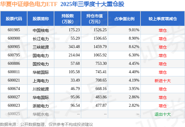 从基金畛域来看,中原中证绿色电力ETF基金2025年三季度公布的基金畛域为1.69亿元,较上一期畛域1.36亿元变化了3319.45万元,环比变化了24.39%。该基金最新一期钞票成立为:股票占净值比99.81%,无债券类钞票,现款占净值比0.31%。从基金握仓来看,该基金当季前十大股票仓位达55.5%,第一大重仓股为中国核电(601985),握仓占比为9.01%。